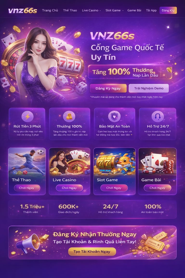 Bước sang năm 2026, VNZ66 tiếp tục khẳng định vị thế hàng đầu trong lĩnh vực casino online với hệ sinh thái game phong phú, giao dịch siêu tốc và chính sách ưu đãi hấp dẫn bậc nhất thị trường.